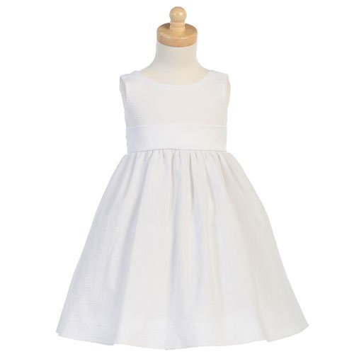A cute classic style spring dress for your little girl from Lito. A darling white on white stripe dress with a matching white sash that ties in a bow in back. The fresh look of Seersucker perfect for Spring!