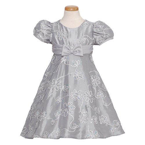 Baby and toddler girls will love this silver sequin Christmas dress by Rare Editions. She'll be lovely and ladylike in this silver taffeta sequin soutache dress. A band at the waist adds feminine flair and ties in the back. Adorable puff sleeves and flowing sequin flowers throughout will not only create fond memories but it will also look great in your family holiday photographs. This dress would also be perfect for the little flower girl. Features button closure in the back.