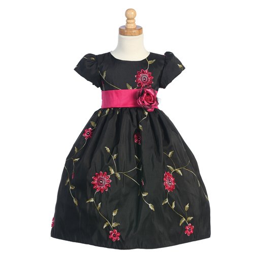 This is a beautiful special occasion dress for your little girl from Lito. This taffeta dress is flocked with a hot pink floral stitching. The lovely sash at the waist features an attached flower and ties in the back. Perfect dress for any special occasion.