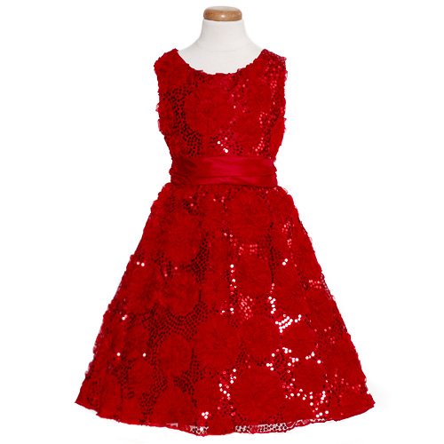 A gorgeous red Christmas dress by designer Rare Editions for your little girl to wear this holiday season. The sleeveless dress is covered in red sequins and mesh rosettes for maximum sparkle and texture. The attached ruched sash ties in back. There's an attached crinoline with netting for added fullness. Zips in back. A classic, elegant design suitable for flower girls, special occasions and holiday parties.
