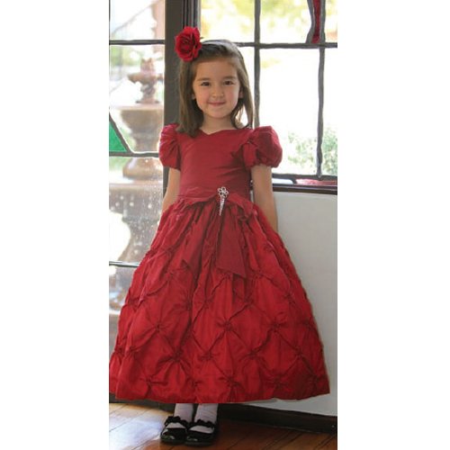 A fabulous dress for any special day from Angels Garment Company. This charming red taffeta dress features a diamond stitch skirt, short puff sleeves and a pretty tie bow with removable rhinestone pin accent. Made in the USA.