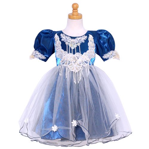 Your baby girl will shine in this fabulous navy blue satin pageant dress by Peachy Kids. The navy blue satin dress has short sleeves and a bodice trimmed in white lace appliques with pearls and sequins. The floor-length skirt is made of four layers. The top two layers are white tulle edged in navy blue with pick-ups that are accented by beaded flower appliques. Underneath is a layer of navy blue satin. The underskirt is an attached crinoline with a tulle ruffle for added fullness. There is a large, attached satin bow in back, and side sash that ties in back for a perfect fit. Zipper closure in back. Included is a matching satin hair bow. This fancy dress is great for formal occasions, pageants, even dress-up or Halloween costumes.